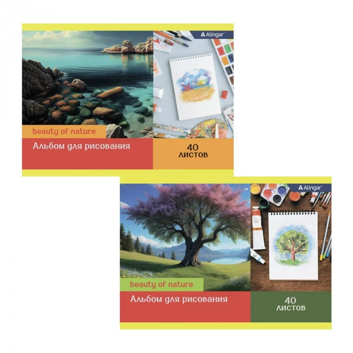 Альбом для рисования А4 40л. Alingar, на скрепке, мелованный картон(стандарт) 210г/м2, офсет 100 г/м2, "Beauty of nature" AL11426