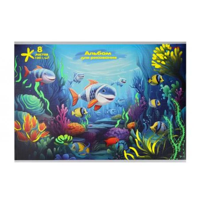 Альбом для рисования А4 8л. РАЗНЫЕ РЫБКИ (08-7518) скрепка,1 диз. в коробке, 6+0 лен 08-7518