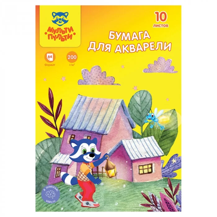 Папка для рисования акварелью «Мульти-Пульти» серия «Енот в Волшебном мире» из мелованного картона с внутренним блоком из рисовальной бумаги формата А4 размером 297*210 мм, плотностью 200 гр/м2. Количество листов в упаковке – 10 штук. Бумага для акварели Мульти-Пульти предназначена для развития творческих способностей и воображения у детей. С ее помощью юный художник сможет создать свои первые акварельные шедевры. Специальная фактура бумаги позволяет краске ложиться равномерно, без разводов. Формат: А4; Количество листов: 10; Внутренний блок: рисовальная бумага; Плотность блока: 200 г/м2.