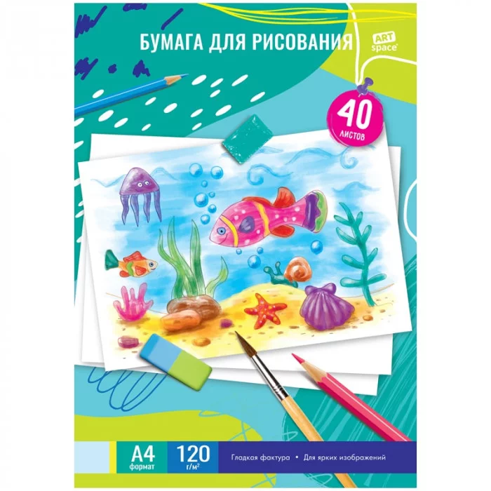 Папка для рисования ArtSpace формата А4, выполнена из мелованного картона. Внутренний блок - 40 листов офсетной бумаги 100% белизны. Размер: 210*297 мм, плотность бумаги: 120 гр/м2. Размер: 210*297 мм; Формат: А4; Материал обложки: мелованный картон; Внутренний блок: офсетная бумага; Количество листов: 40; Плотность бумаги: 120 гр/м2.