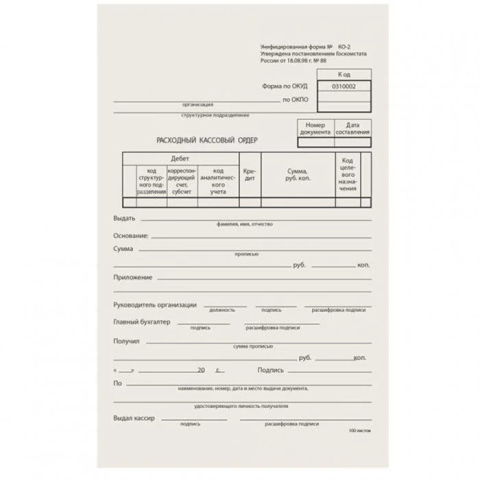 Бланк бухгалтерский типографский Расходно-кассовый ордер, А5 (134х192 мм) СКЛЕЙКА 100 шт., 130005