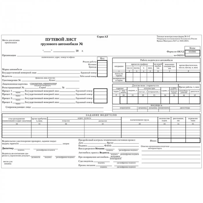 Бланк Путевой лист грузового автомобиля А4 (4С-без талона от 18.01.2017г) оборот., газет., 100 экз Спейс 252456