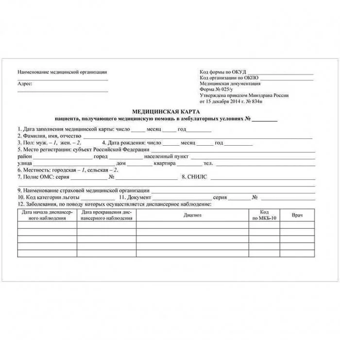 Медицинская карта пациента, получающего медицинскую помощь в амбулаторных условиях, форма №025/у от 15 декабря 2014 г. №834. Формат А5, блок- 48 листов, писчая бумага 60 г/м2, обложка- офсетная бумага 160 г/м2. Скрепление - скрепка.