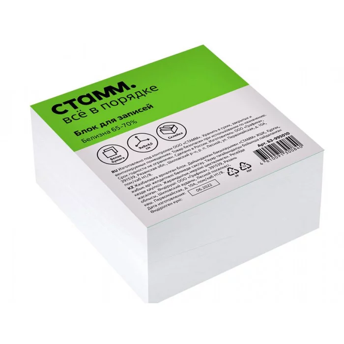 Блок бумаги на склейке «СТАММ» подходит для оперативных записей необходимой информации. Размер листа в блоке: 90*90 мм, высота блока – 45 мм. Цвет бумаги блока - белый со стандартом белизны 65-70%. Блок для записей проклеен по одному краю. Представлен в индивидуальной упаковке в термоусадочной плёнке. Белизна блока: 65-70%; Размер: 90*90*45 мм; Цвет бумаги блока: белый; Плотность бумаги: 55-60 г/м²; Склейка: есть; Ориентировочное кол-во листов: 470-480.