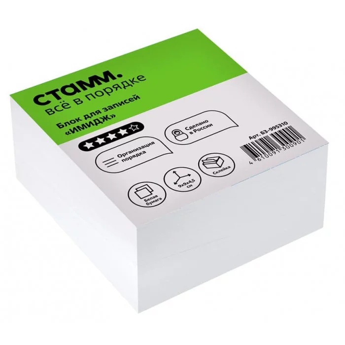 Блок бумаги на склейке «СТАММ» Имидж подходит для оперативных записей необходимой информации. Размер листа в блоке: 90*90 мм, высота блока – 45 мм. Цвет бумаги блока - белый со стандартом белизны 90-92%. Блок для записей представлен в индивидуальной упаковке в термоусадочной плёнке. Белизна блока: 90-92%; Размер: 90*90*45 мм; Цвет бумаги блока: белый; Плотность бумаги: 80 г/м²; Склейка: есть; Ориентировочное кол-во листов: 405-415.
