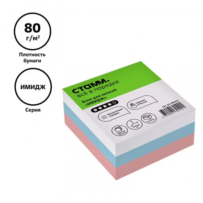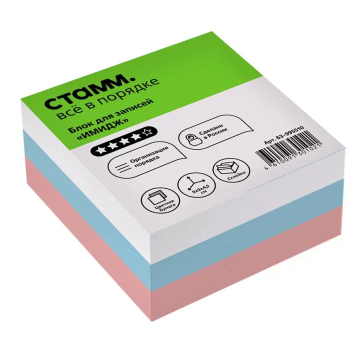 Блок бумаги на склейке «СТАММ» Имидж подходит для оперативных записей необходимой информации. Размер листа в блоке: 90*90 мм, высота блока – 45 мм. Блок для записей представлен в индивидуальной упаковке в термоусадочной плёнке. Размер: 90*90*45 мм; Цвет бумаги блока: триколор; Плотность бумаги: 80 г/м²; Склейка: есть; Ориентировочное кол-во листов: 405-415.