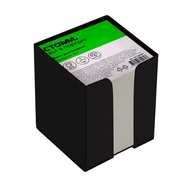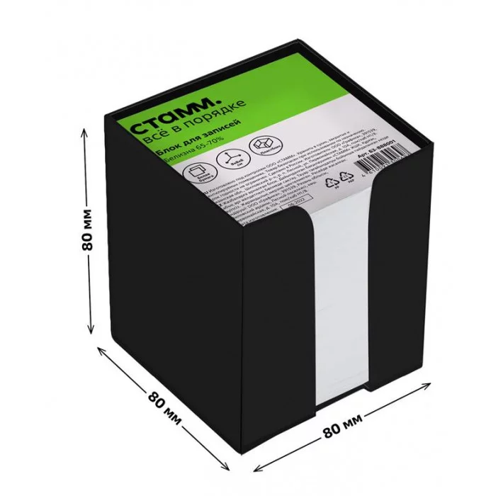 Блок бумаги «СТАММ» в чёрном пластиковом боксе подходит для оперативных записей необходимой информации. Размер листа в блоке - 80*80 мм, высота блока - 80 мм. Цвет бумаги блока - белый со стандартом белизны 65-70%. Представлен в индивидуальной упаковке в термоусадочной пленке. Белизна блока: 65-70%; Размер: 80*80*80 мм; Цвет бумаги блока: белый; Плотность бумаги: 55-60 г/м²; Ориентировочное кол-во листов: 840-850.