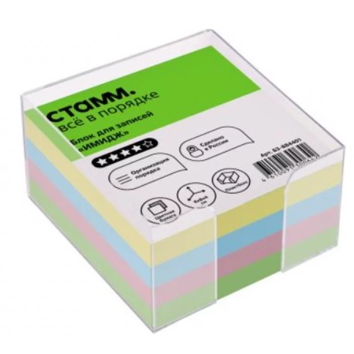 Блок бумаги СТАММ Имидж в прозрачном пластиковом боксе подходит для оперативных записей необходимой информации. Размер листа в блоке: 80*80 мм, высота блока - 40 мм. Блок для записей представлен в индивидуальной упаковке в термоусадочной плёнке. Размер: 80*80*40 мм; Цвет бумаги блока: ассорти; Плотность бумаги: 80 г/м².