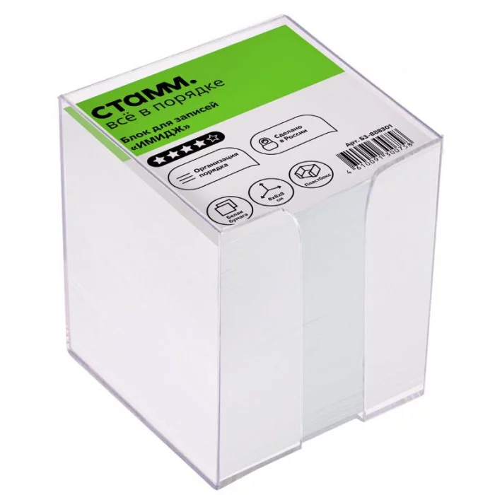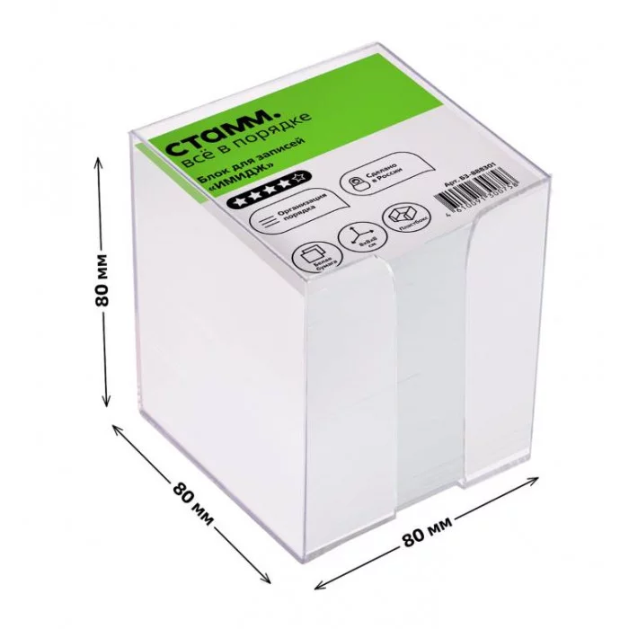 Блок бумаги «СТАММ» Имидж в прозрачном пластиковом боксе подходит для оперативных записей необходимой информации. Размер листа в блоке - 80*80 мм, высота блока - 80 мм. Цвет бумаги блока - белый со стандартом белизны 90-92%. Представлен в индивидуальной упаковке в термоусадочной пленке. ∙ Белизна блока: 90-92%; ∙ Размер: 80*80*80 мм; ∙ Цвет бумаги блока: белый; ∙ Плотность бумаги: 80 г/м²; Ориентировочное кол-во листов: 720-735.