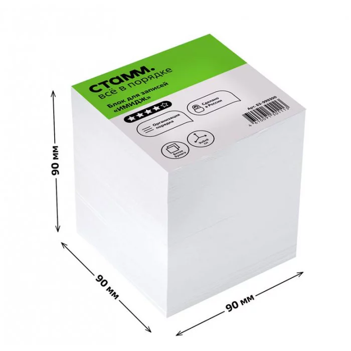 Блок бумаги «СТАММ» Имидж подходит для оперативных записей необходимой информации. Размер листа в блоке - 90*90 мм, высота блока - 90 мм. Цвет бумаги блока - белый со стандартом белизны 90-92%. Может использоваться в пластиковых подставках и настольных органайзерах. Блок для записей представлен в индивидуальной упаковке в термоусадочной пленке.