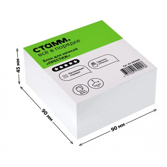 Блок бумаги «СТАММ» Престиж подходит для оперативных записей необходимой информации. Размер листа в блоке: 90*90 мм, высота блока – 45 мм. Цвет бумаги блока - белый со стандартом белизны 100%. Может использоваться в пластиковых подставках и настольных органайзерах. Блок для записей представлен в индивидуальной упаковке в термоусадочной плёнке. Белизна блока: 100%; Размер: 90*90*45 мм; Цвет бумаги блока: белый; Плотность бумаги: 100 г/м²; Ориентировочное кол-во листов: 325-335.