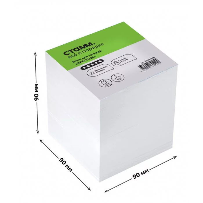 Блок бумаги «СТАММ» Престиж подходит для оперативных записей необходимой информации.Размер листа в блоке: 90*90 мм, высота блока – 90 мм. Цвет бумаги блока - белый со стандартом белизны 100%. Может использоваться в пластиковых подставках и настольных органайзерах. Блок для записей представлен в индивидуальной упаковке в термоусадочной плёнке.