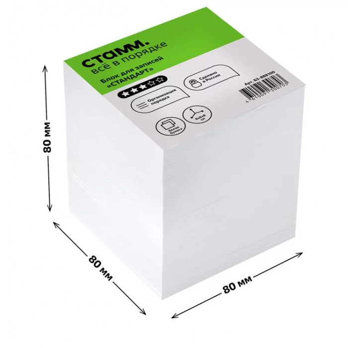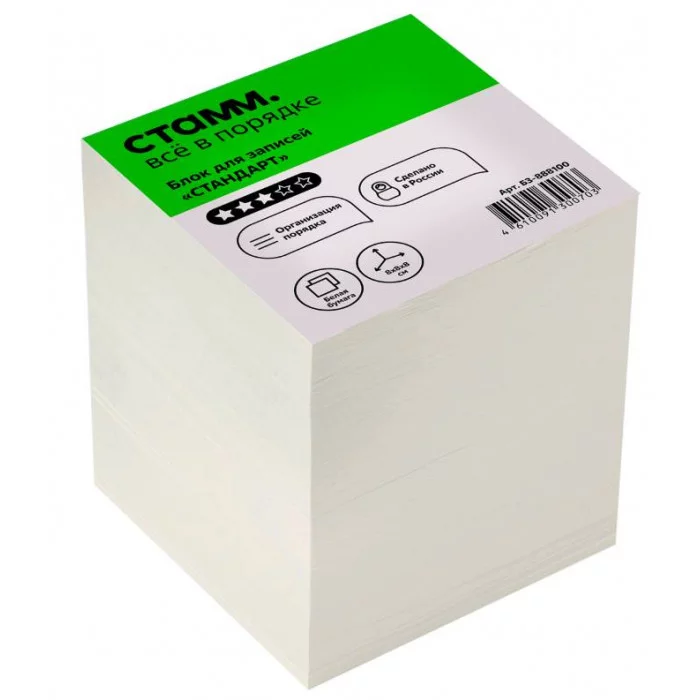 Блок бумаги «СТАММ» Стандарт подходит для оперативных записей необходимой информации. Размер листа в блоке: 80*80 мм, высота блока – 80 мм. Цвет бумаги блока - белый со стандартом белизны 90-92%. Может использоваться в пластиковых подставках и настольных органайзерах. Блок для записей представлен в индивидуальной упаковке в термоусадочной плёнке. Белизна блока: 90-92%; Размер: 80*80*80 мм; Цвет бумаги блока: белый; Плотность бумаги: 65 г/м²; Ориентировочное кол-во листов: 720-730.