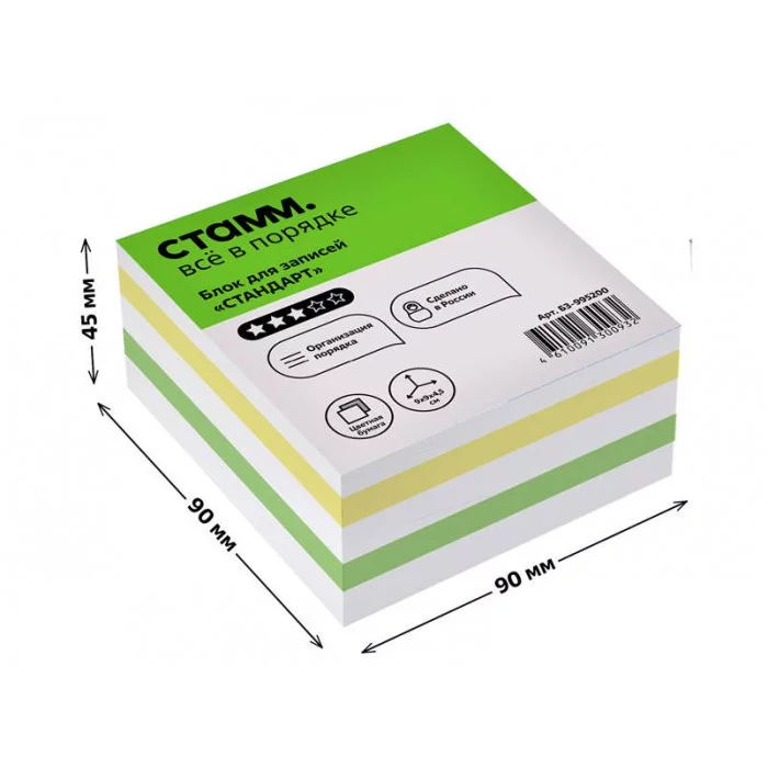 Блок бумаги «СТАММ» Стандарт подходит для оперативных записей необходимой информации. Размер листа в блоке: 90*90 мм, высота блока – 45 мм. Может использоваться в пластиковых подставках и настольных органайзерах. Блок для записей представлен в индивидуальной упаковке в термоусадочной плёнке. Размер: 90*90*45 мм; Цвет бумаги блока: ассорти; Плотность бумаги: 65-80 г/м²; Ориентировочное кол-во листов: 405-415.