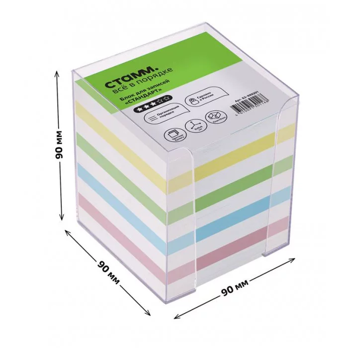 Блок бумаги «СТАММ» Стандарт в прозрачном пластиковом боксе подходит для оперативных записей необходимой информации. Размер листа в блоке: 90*90 мм, высота блока – 90 мм. Блок для записей представлен в индивидуальной упаковке в термоусадочной плёнке. Размер: 90*90*90 мм; Цвет бумаги блока: ассорти; Плотность бумаги: 65-80 г/м²; Ориентировочное кол-во листов: 525-535.