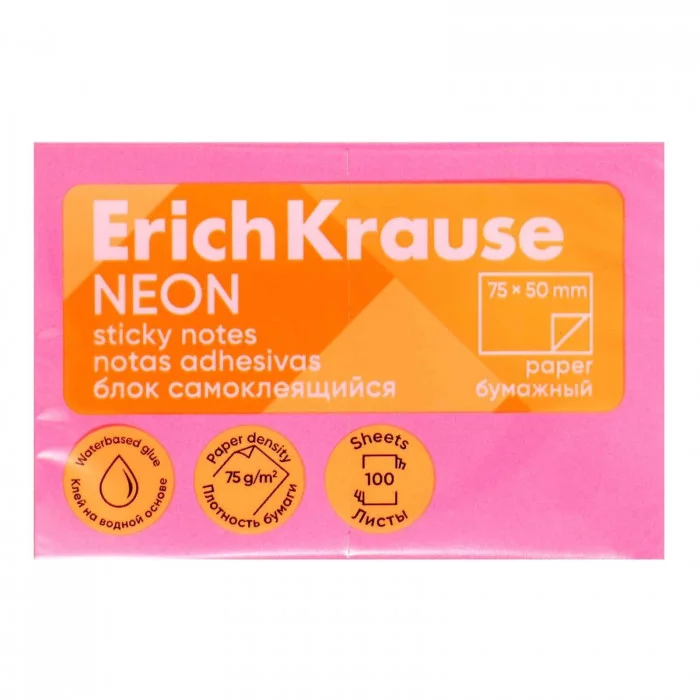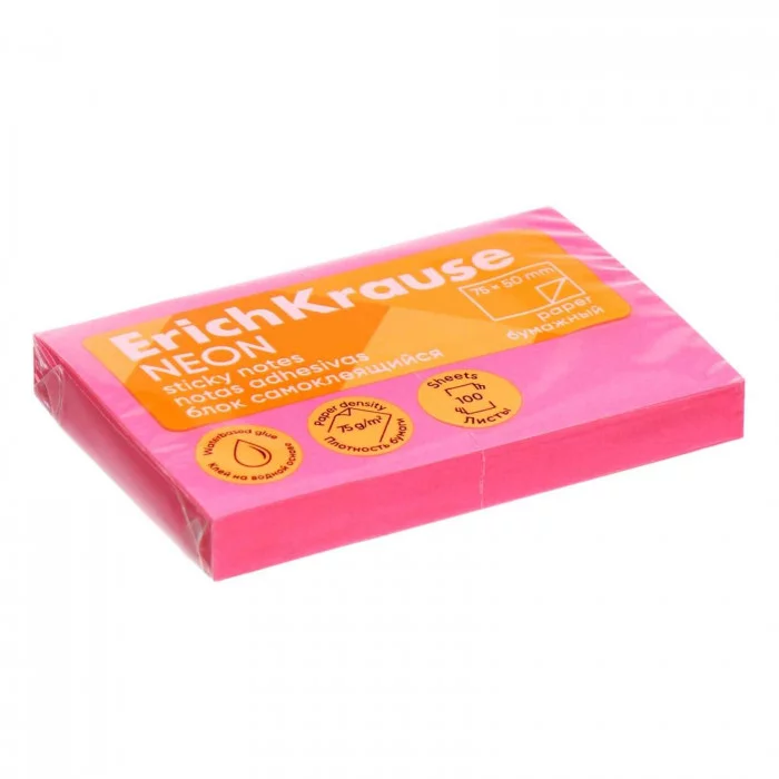 Блок самоклеящийся бумажный ErichKrause Neon, 75х50 мм, 100 листов, розовый 61690
