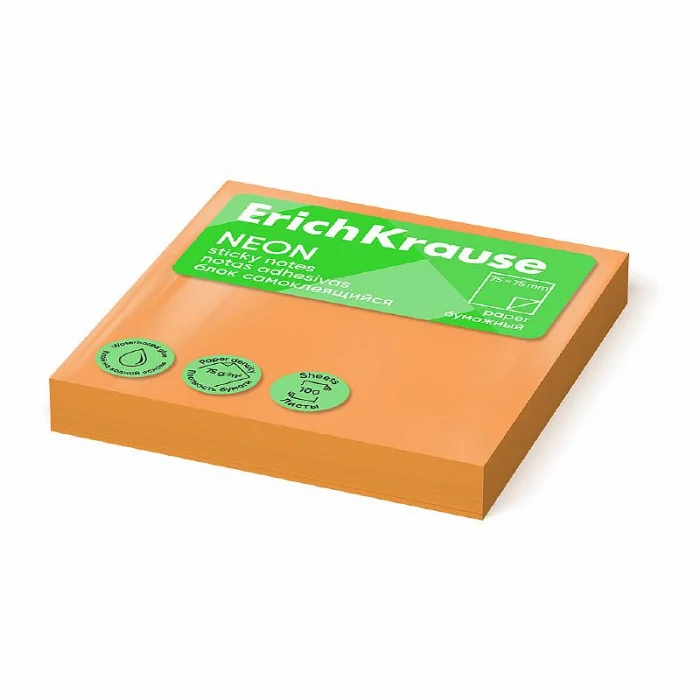 Блок самоклеящийся бумажный ErichKrause Neon, 75х75 мм, 100 листов, оранжевый 61660