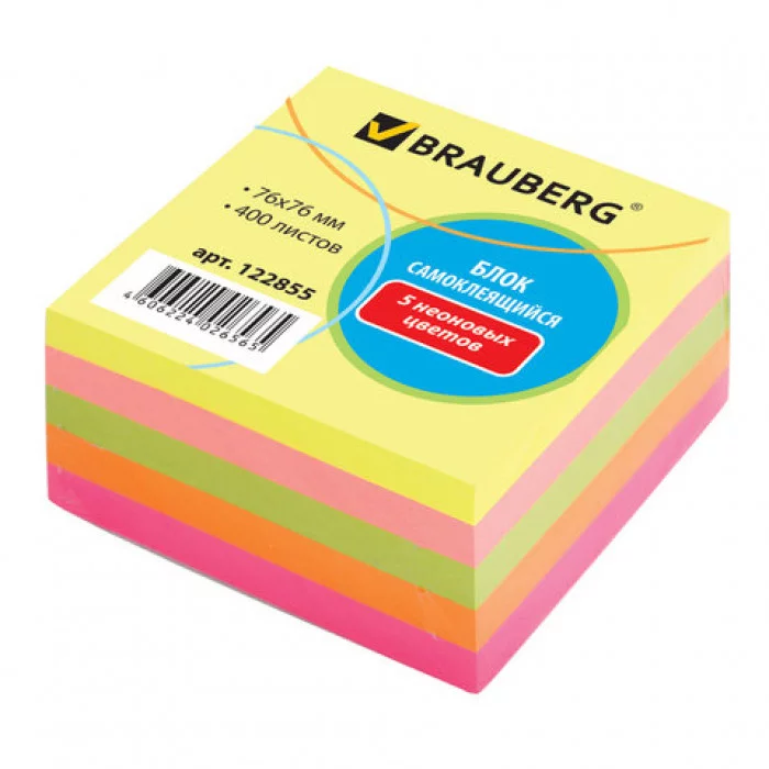 Блок самоклеящийся (стикеры), BRAUBERG, НЕОНОВЫЙ, 76х76 мм, 400 листов, 5 цветов, 122855