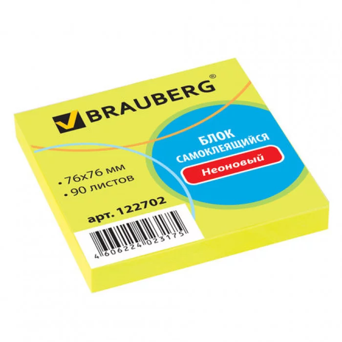 Блок самоклеящийся стикеры BRAUBERG, НЕОНОВЫЙ, 76х76 мм, 90 листов, желтый, 122702