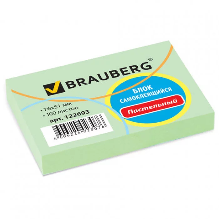 Блок самоклеящийся стикеры BRAUBERG, ПАСТЕЛЬНЫЙ, 76х51 мм, 100 листов, зеленый, 122693