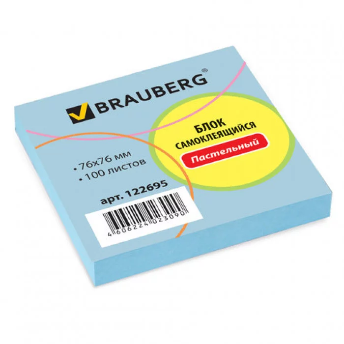 Блок самоклеящийся стикеры BRAUBERG, ПАСТЕЛЬНЫЙ, 76х76 мм, 100 листов, голубой, 122695