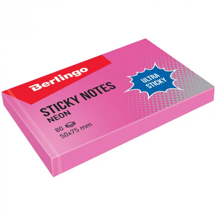 Самоклеящийся блок Berlingo Ultra Sticky 50*75мм, 80л, розовый неон BERLINGO 287185