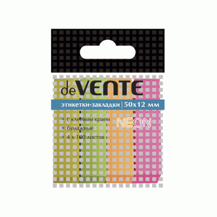 Набор самоклеящихся этикеток-закладок "deVENTE" бумажные 50x12 мм, 4x100 листов, офсет 75 г/м², 4 неоновых цвета, в пластиковом пакете с европодвесом