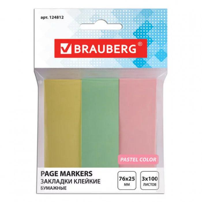 Закладки клейкие BRAUBERG ПАСТЕЛЬНЫЕ, бумажные, 76х25 мм, 3 цветах100 листов, ассорти, европодвес, 124812