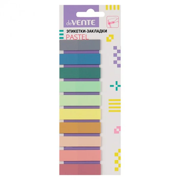 Набор самоклеящихся этикеток-закладок "deVENTE. Pastel" пластиковые полупрозрачные 45x12 мм, 10x20 листов, 10 пастельных цветов, в картонном блистере и пластиковом пакете с европодвесом