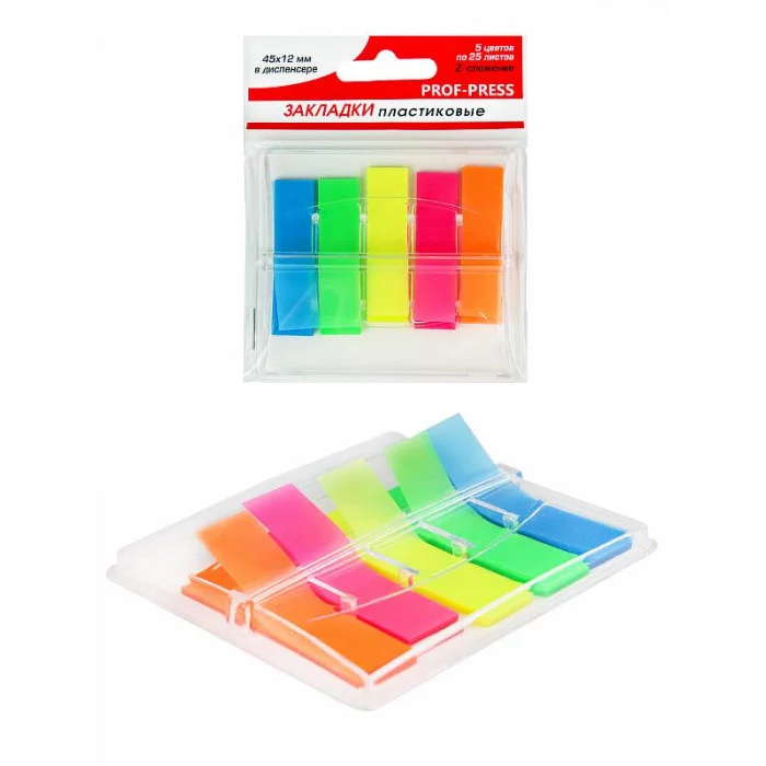 Пластиковые закладки с клеевым краем предназначены для временных пометок страниц. На закладках можно делать надписи. Закладки изготовлены из цветной полупрозрачной полимерной плёнки, которая не закрывает текст страницы. Специальный клеевой состав позволяет надёжно крепить и многократно переклеивать закладки, не оставляя следов и не повреждая поверхность. В упаковке: 5 цветов по 25 листов. Размер: 45х12 мм.