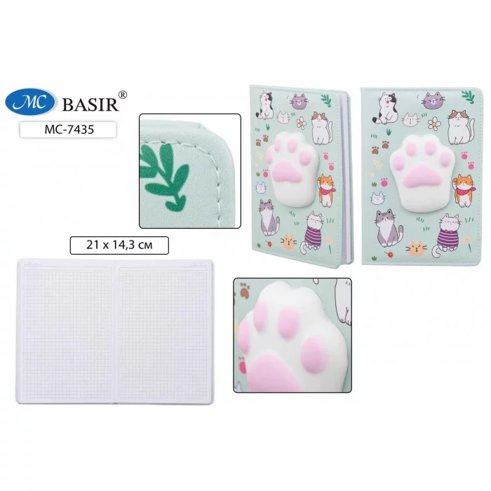 Записная книжка Mc Basir "Лапка сквиш", А5, 80 листов, ПВХ, твердый переплет, клетка (МС - 7435). Записная книга необходимый аксессуар для любого человека. Столько важных дел нужно успеть сделать и ничего не упустить. И как приятно записывать мысли и планы в красивую записную книжку. Удобный формат А5 легко помещается в сумку, внутренний блок 80 листов. Твёрдая обложка кожзама из кожзама выполнена в ярком дизайне.