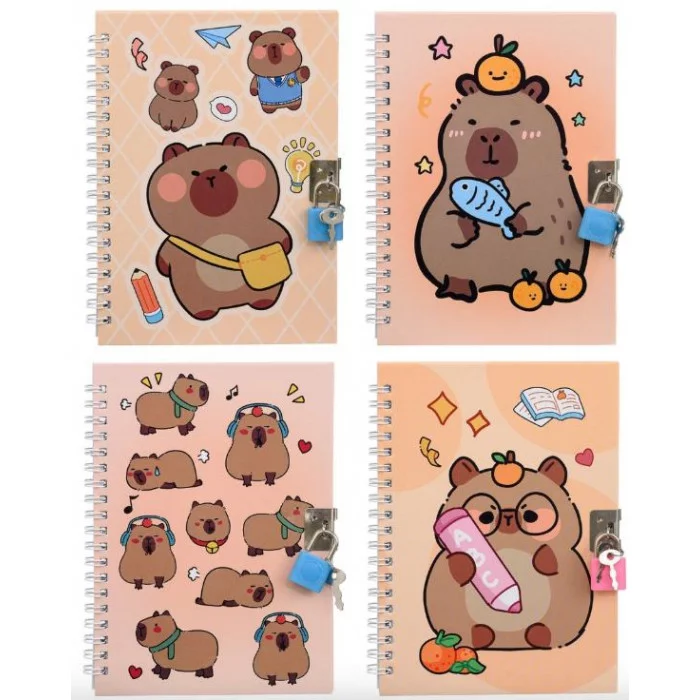 Блокнот детский+замочек: "КАПИБАРА"; цветная 7БЦ обложка с рисунком /ассорти/, блок-клетка, на гребн МС-7247
