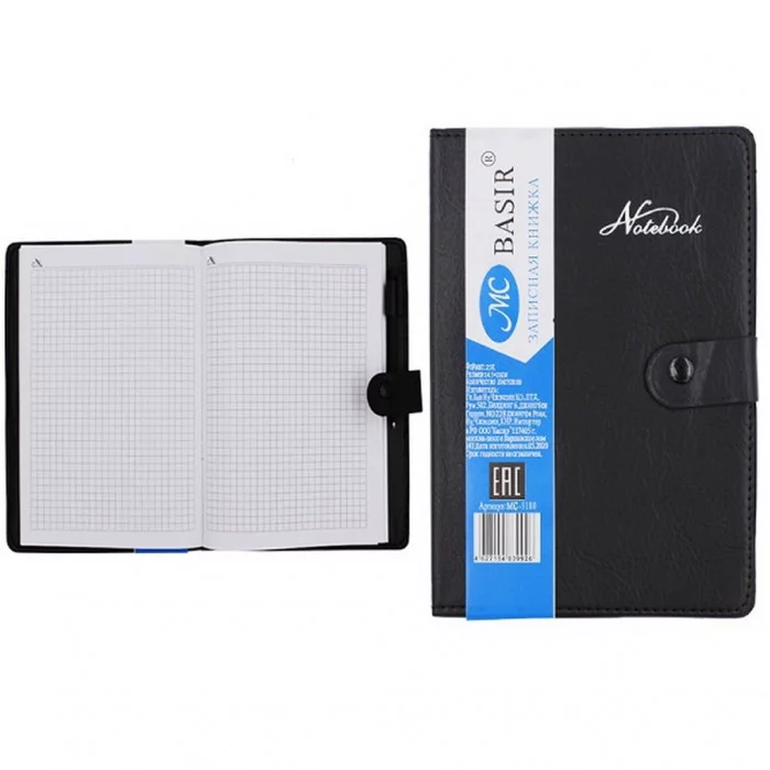 Записная книжка материал-кожезаменитель, цвет-чёрный, с прострочкой, блок-1 офсет, клетка, на кнопке МС-5180
