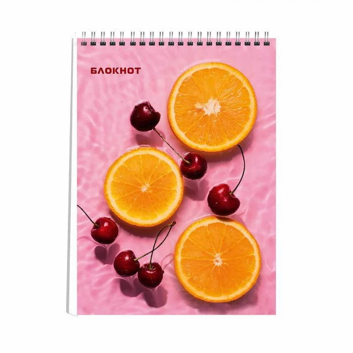 Блокнот А5, 80л. Гребень. Обложка: мелованный картон, глянцевая ламинация. Подложка: переплетный картон. Бумага: белый офсет 60 г/м2. Клетка. "Летний микс"