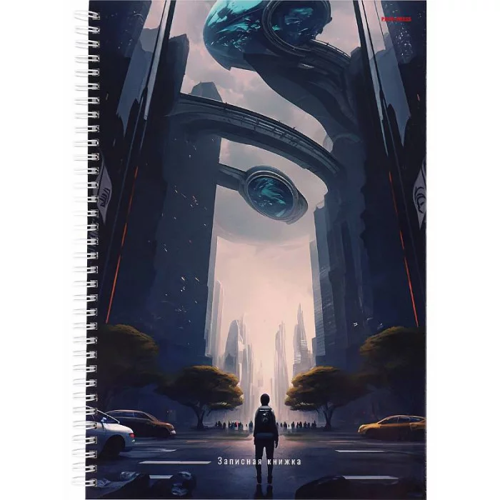 Записная книга на гребне А4 100л. ФАНТАСТИЧЕСКИЙ ГОРОД (100-9538) (гребень сбоку, гл.ламинир-ие, 7БЦ) 100-9538