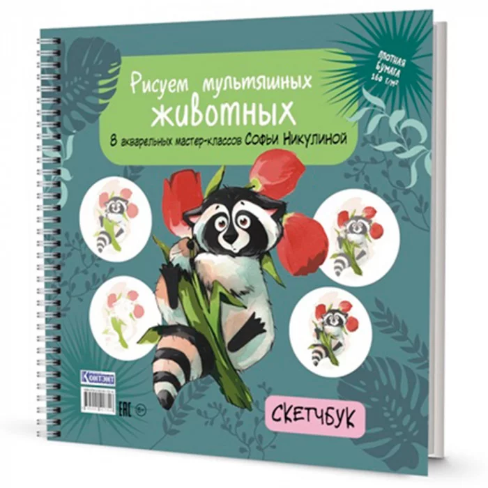 Скетчбук 120х170 мм, 32 л., "Рисуем мультяшных животных. Енот", Контэнт-Канц, гребень, мел.картон, выб-лак, зеленый 97832