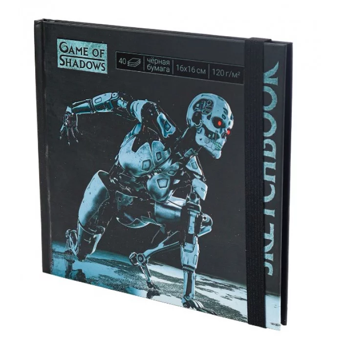 Скетчбук 160*160 мм., 40л., "Т-800", 120г/м2, Миленд, 7БЦ, матовая ламинация, выб. лак, резинка, чёрный офсет