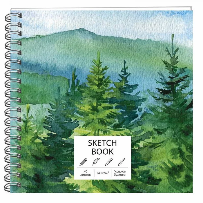 Скетчбук (195х195), 40л. Евроспираль. Твердая обложка 7БЦ, матовая ламинация. Бумага белый офсет 140г/м2. "Акварельный пейзаж"
