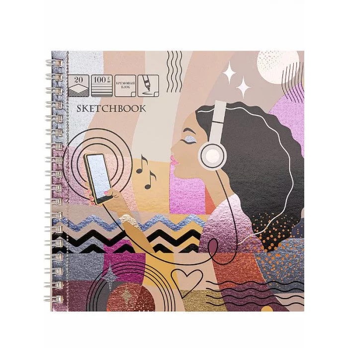 Скетчбук 20л. ДЕВУШКА С ПЛЕЕРОМ (20-5172)греб,гл.лам,микроп на отрыв,твин-лак,хол.фольга 160х160мм