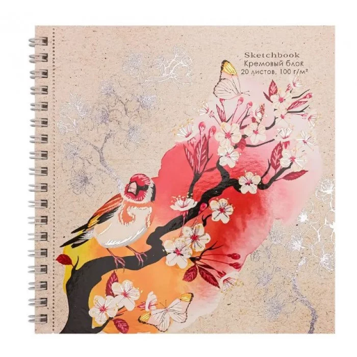 Скетчбук 160*160 мм., 20л. "Птичка на ветке" 100 г/м2, Проф-Пресс, гребень, ламинация, твин-лак, холодная фольга, кремовая бумага