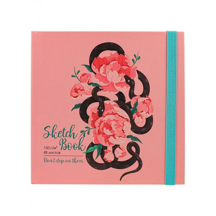 Скетчбук 48л. ПИОНЫ И ЗМЕИ (48-0636) 7БЦ, матовая ламинация, ляссе, лен, резинка, 165х165мм 48-0636