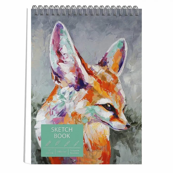 Скетчбук А5+ (160х240), 30л. Евроспираль по короткой стороне. Тв. обл, глянц. лам., тиснение фольгой серебро. Бум.180 г/м2, перфорация. "Лис"