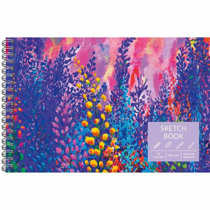 Скетчбук А5+ (160х240), 30л. Евроспираль по короткой стороне. Тв. обл, глянц. лам., тиснение фольгой серебро. Бум.180 г/м2, перфорация. "Люпин"