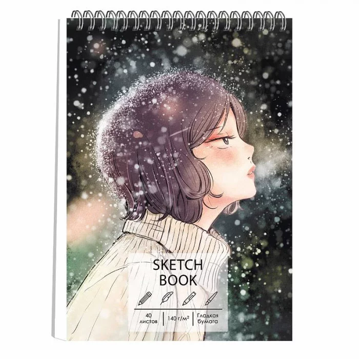Скетчбук А5 (140х200), 40л. Евроспираль. Твердая обложка 7БЦ, матовая ламинация. Бумага белый офсет 140г/м2. "Снежно (Эксклюзив)"