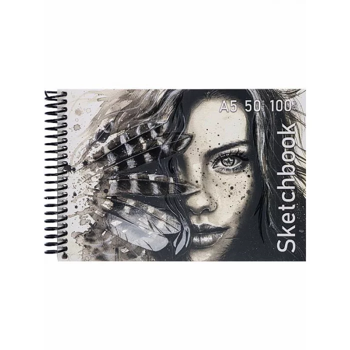 Скетчбук А5 50л., "Девушка с перьями", 100г/м2, Миленд, спираль, матовая ламинация, выб. лак, жёсткая подложка, офсет
