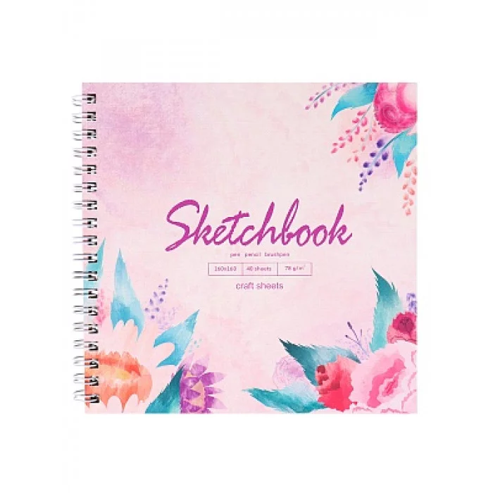 Скетчбук 160*160 мм., 40л., "Цветы" 78г/м2, Миленд, гребень, матовая ламинация, лён, крафт блок