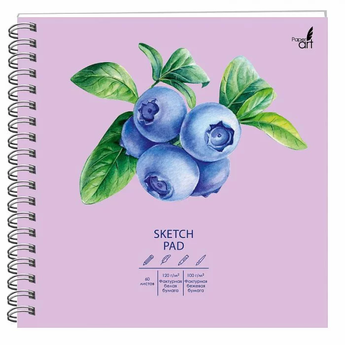 Скетчпад (190х190), 60л. Евроспираль. Мелованный картон, ламинация Soft Touch. Комбинир.блок (бум.бел.120г - 30л, бум.рисов.беж.100г - 30л). "Голубика"
