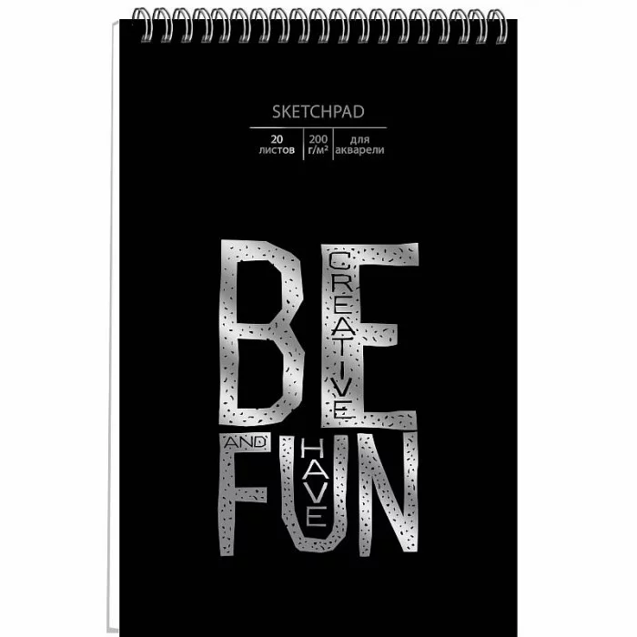 Скетчпад 250 х170 мм. Евроспираль. Обл.: черный дизайнерский картон, тиснение фольг. серебро. 20 л, акварел. бумага, 200 г.м2. с перфорацией.. "Be creative"
