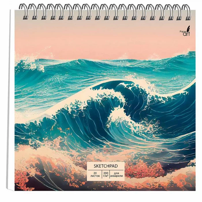 Скетчпад для акварели, (250х250) 20л. Евроспираль. Обл.: мелов.картон. Подложка: переплет.картон. Блок: акварельная бумага 200г/м2, белая. Перфорация. "Волна"
