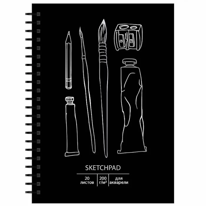 Скетчпад для акварели А5 (140х197) 20л. Евроспираль. Обл.черн.тон.карт,тисн.фольгой серебро. Подложка:пер.карт. Блок:акварель.бум.200г,белая. Перфорац. "Вдохновение"